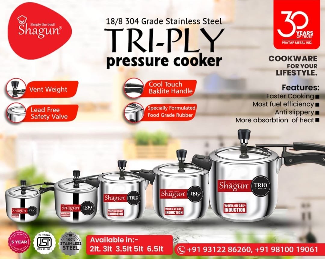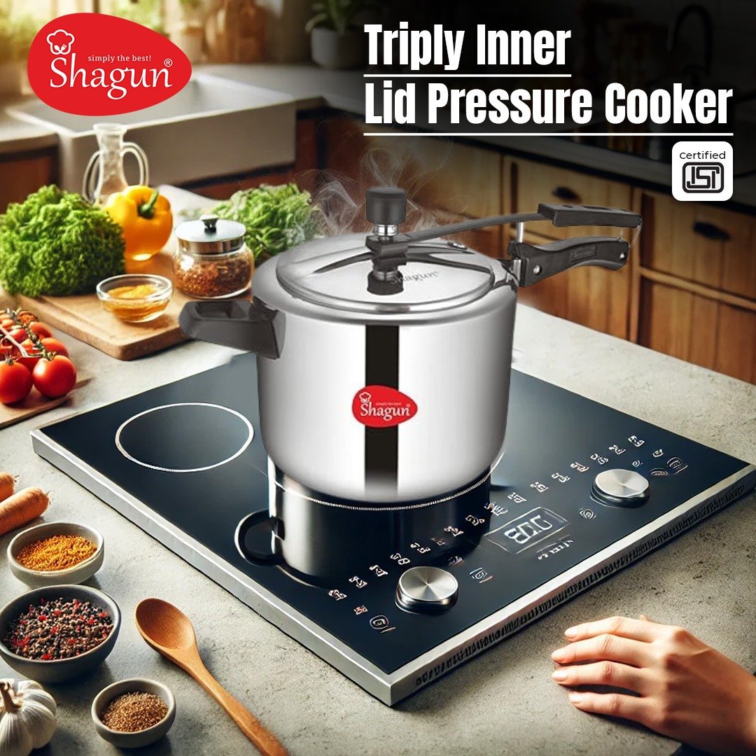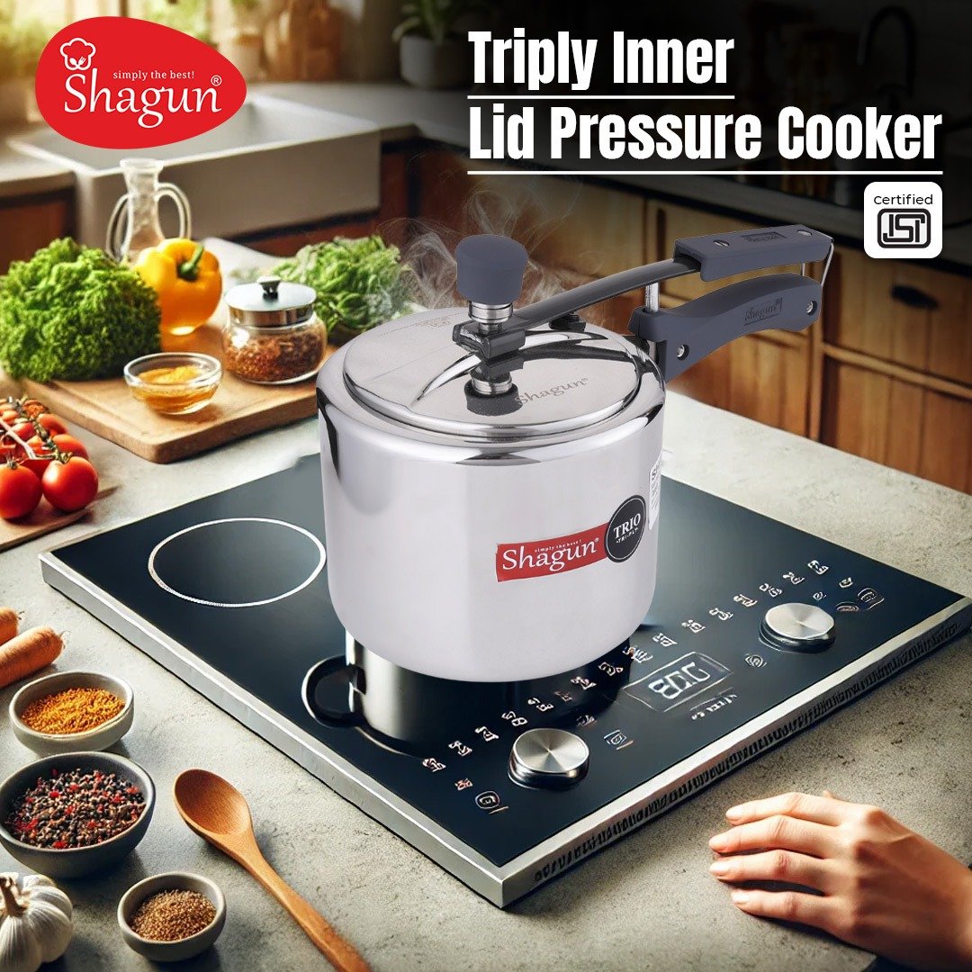 Introducing the Shagun Tri-Ply Pressure Cooker – a premium quality cookware solution designed to enhance your cooking experience. Crafted from 18/8 304 grade stainless steel, this pressure cooker is built for durability, safety, and efficiency. Whether you’re cooking on gas or induction, Shagun’s tri-ply construction ensures faster and even heat distribution, saving time and fuel.